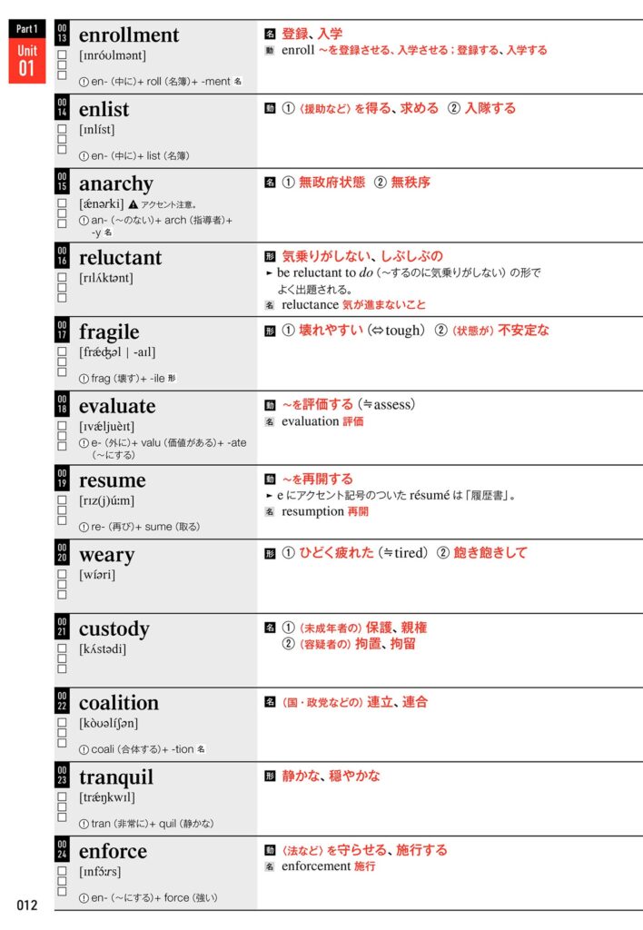 さっと見た後は、じっくり1つ1つの単語を覚えにかかるわけですが、そのときも1つ1つを一発で覚えようとするのではなく、ページ単位で上から下まで何周も何周もして覚えるようにしてください。
